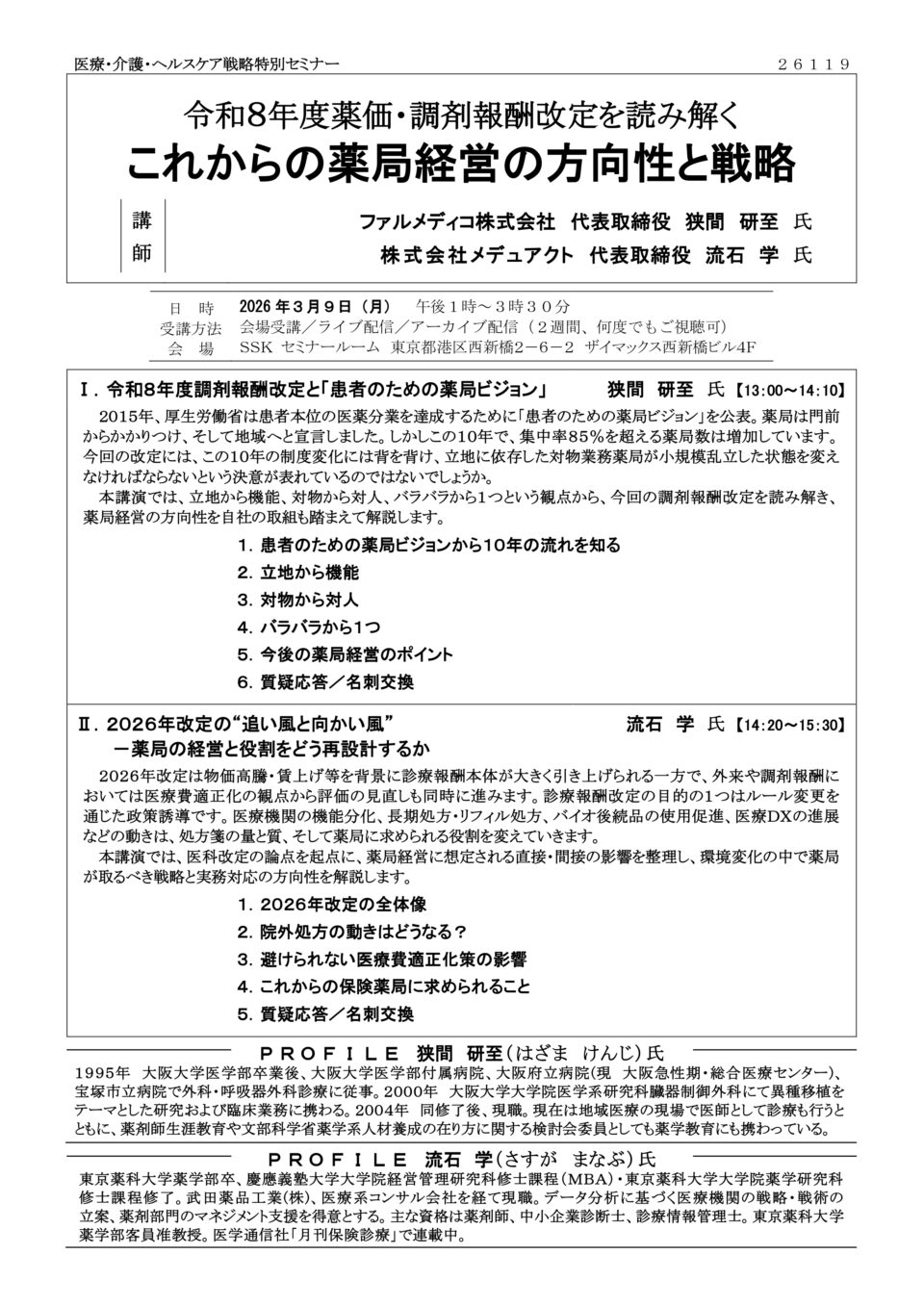 最新記事【3月9日開催】新社会システム総合研究所主催セミナー「令和8年度薬価・調剤報酬改定を読み解く これからの薬局経営の方向性と戦略」に当社代表の流石学が登壇いたします
