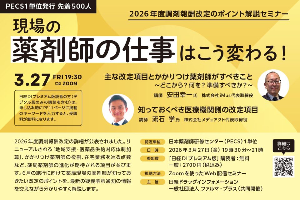 月刊誌「日経DI プレミアム版」読者参加無料のオンラインサービス「日経DI カレッジ」による90分の認定単位付きセミナー「2026年度調剤報酬改定のポイント解説~現場の薬剤師の仕事はこう変わる!~」に当社代表の流石学が登壇いたします。